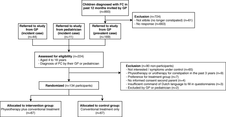 Methods: We designed a randomized controlled trial of children aged 4-17 years with functional constipation diagnosed by a general practitioner or pediatrician. Children in the intervention group received physiotherapy plus conventional treatment, and those in the control group received conventional treatment only. Follow-up measurements took place at 4 and 8 months. The primary outcome was treatment success defined according to the Rome-III criteria as the absence of functional constipation, with no laxative use. Secondary outcomes were absence of functional constipation irrespective of laxative use, quality of life, global perceived effect, and costs. Children were recruited from September 2014 to February 2017. Initially, we aimed to include children with recent symptom onset. However, in the first phase of enrollment we were confronted with an unforeseen recruitment problem: many children and their parents refused randomization because physiotherapy was considered too burdensome for the stage of disease. Therefore, we decided to also include children with a longer duration of symptoms. In total 134 children were included.