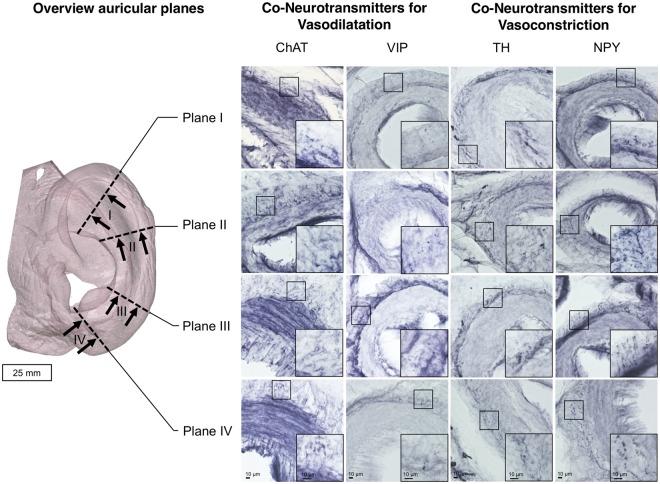 Auricular vasomotor responses are considered to be signs of clinical conditions including migraine. The mechanisms of auricular vasomotor control are still debatable. This study aimed at investigating perivascular co-transmitters of vasomotor control in the auricle. Another aim was to provide three-dimensional arterial maps of the auricle, as a proxy of periarterial autonomic innervation. Twelve paired human auricles were used to visualize the arteries following Spalteholz clearing and μ-CT-based reconstruction. Perivascular innervation staining was conducted using anti-tyrosine hydroxylase (TH), anti-neuropeptide Y (NPY), anti-vasoactive intestinal peptide (VIP) and anti-choline acetyl transferase (ChAT). The combined Spalteholz technique and μ-CT revealed a highly consistent arrangement of the auricular vasculature. The superficial temporal (STA) and posterior auricular artery (PAA) supply the helical rim arcade and arcade, with the STA mainly forming the superior and the PAA forming the middle and inferior auricular artery. Co-existence of sympathetic NPY+ and TH+ terminals mediating vasoconstriction, and VIP+ and ACh+ indicating cholinergic vasodilatation, was found in the perivascular zone. The presence of both sympathetic vasoconstriction and cholinergic co-innervation for active vasodilatation was shown in the perivascular auricular zone. Assuming that the highly-consistent vasculature gives way to these terminals, this periarterial innervation may be found spread out across the helix.