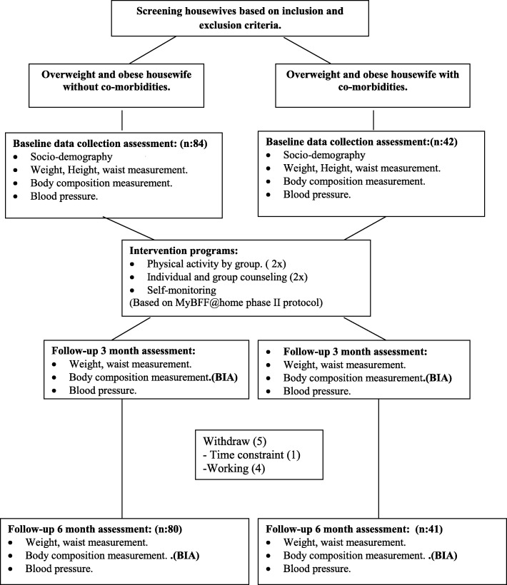 Methods: This is a follow-up study among 84 obese housewives without co-morbidities aged 18 to 59 years old who previously participated as a control group (delayed intervention, G1) in the My Body is Fit and Fabulous at Home (MyBFF@home) Phase II. Baseline data were obtained from 12 month data collection for this group. A new group of 42 obese housewives with co-morbidities (G2) were also recruited. Both groups received a 6 month intervention (July-December 2015) consisting of dietary counselling, physical activity (PA) and self-monitoring tools (PA diary, food diary and pedometer). Study parameters included weight, height, waist circumference, blood pressure and body compositions. Body compositions were measured using a bioelectrical impedance analysis device, Inbody 720. Descriptive and repeated measures ANOVA analyses were performed using SPSS 21.