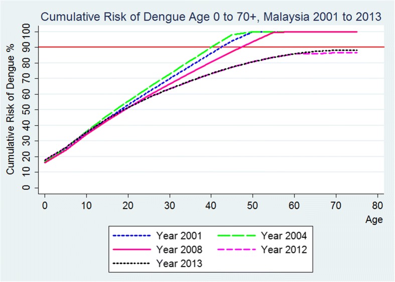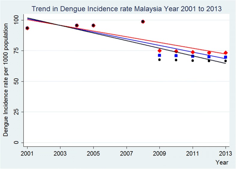 Results: The dengue incidence in Malaysia varied from 69.9 to 93.4 per 1000 population (pkp) between 2001 and 2013.The temporal trend in incidence rate was decreasing since 2001. It has been reducing at an average rate of 2.57 pkp per year from 2001 to 2013 (p = 0.011). The age-specific incidence of dengue decreased steadily with dengue incidence reaching zero by age > 70 years. Dengue notification rate has remained stable since 2001 and the number of notified cases each year was only a small fraction of the incident cases (0.7 to 2.3%). Similarly, the dengue hospitalization was larger but still a small fraction of the incident cases (3.0 to 5.6%).