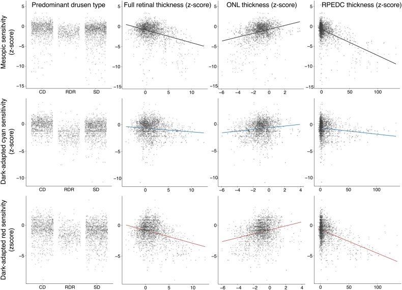Results: Mean deviation values for eyes with cuticular, soft, and reticular drusen were similar for mesopic (-2.1, -3.4, and -3.6 dB) and dark-adapted red (-1.4, -2.6, and -3.3 dB) FCP. For the dark-adapted cyan FCP (0.1, -1.9, and -5.0 dB) and for the cyan-red sensitivity difference (+1.0, +0.5, and -2.4 dB), the mean deviation values differed significantly in dependence of the predominant drusen type (one-way ANOVA; p < 0.05). RPEDC thickness was associated with reduction of mesopic sensitivity (-0.34 dB/10 µm RPEDC thickening; p < 0.001), dark-adapted cyan sensitivity (-0.11 dB/10 µm RPEDC thickening; p = 0.003), and dark-adapted red sensitivity (-0.26 dB/10 µm RPEDC thickening; p < 0.001).