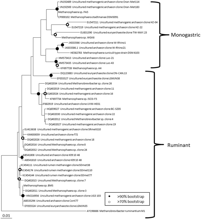 The genus Methanosphaera is a well-recognized but poorly characterized member of the mammalian gut microbiome, and distinctive from Methanobrevibacter smithii for its ability to induce a pro-inflammatory response in humans. Here we have used a combination of culture- and metagenomics-based approaches to expand the representation and information for the genus, which has supported the examination of their phylogeny and physiological capacity. Novel isolates of the genus Methanosphaera were recovered from bovine rumen digesta and human stool, with the bovine isolate remarkable for its large genome size relative to other Methanosphaera isolates from monogastric hosts. To substantiate this observation, we then recovered seven high-quality Methanosphaera-affiliated population genomes from ruminant and human gut metagenomic datasets. Our analyses confirm a monophyletic origin of Methanosphaera spp. and that the colonization of monogastric and ruminant hosts favors representatives of the genus with different genome sizes, reflecting differences in the genome content needed to persist in these different habitats.