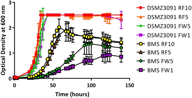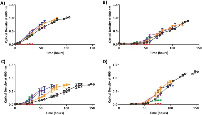 and 171 mM). The growth of the individual cultures is plotted until the time point at which maximal OD600 was measured. Individual values represent the mean (±SD) produced from triplicate cultures