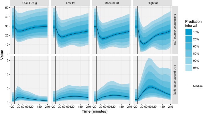 Bile acids released postprandially can modify the rate and extent of lipophilic compounds' absorption. This study aimed to predict the enterohepatic circulation (EHC) of total bile acids (TBAs) in response to caloric intake from their spillover in plasma. A model for TBA EHC was combined with a previously developed gastric emptying (GE) model. Longitudinal gallbladder volumes and TBA plasma concentration data from 30 subjects studied after ingestion of four different test drinks were supplemented with literature data. Postprandial gallbladder refilling periods were implemented to improve model predictions. The TBA hepatic extraction was reduced with the high-fat drink. Basal and nutrient-induced gallbladder emptying rates were altered by type 2 diabetes (T2D). The model was predictive of the central trend and the variability of gallbladder volume and TBA plasma concentration for all test drinks. Integration of this model within physiological pharmacokinetic modeling frameworks could improve the predictions for lipophilic compounds' absorption considerably.