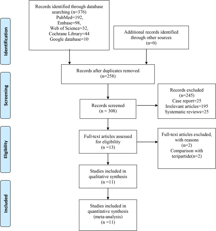 Results: Eleven studies involving 5446 patients (denosumab = 2873, bisphosphonates = 2573) were included in the present meta-analysis. There was no significant difference between the risk of fracture (risk ratio (RR), 1.13; 95% confidence interval (CI), 0.82-1.55; P = 0.466), adverse events (AEs) (RR 1.00; 95% CI 0.96-1.04; P = 0.957) and withdrawn due to AEs (RR 0.68; 95% CI 0.34-137; P = 0.280). Denosumab compared with bisphosphonates significantly increased change in total hip, femoral neck, lumbar spine, and one-third radius bone mineral density (BMD) for postmenopausal osteoporosis patients (P < 0.05).