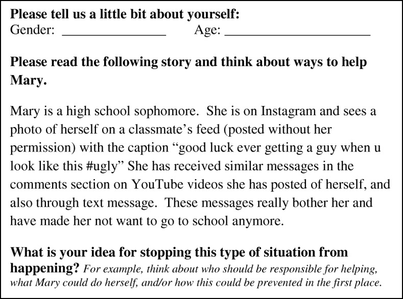Results: 67 eligible adolescents completed the survey. 91% of participants were female with a mean age of 15.3 years (SD = 1.3). Code families emerged regarding people who could be involved in responses to electronic harassment: (1) Individuals targeted by electronic harassment, (2) Friends and bystanders, (3) Adults, and (4) Social media websites and policymakers.