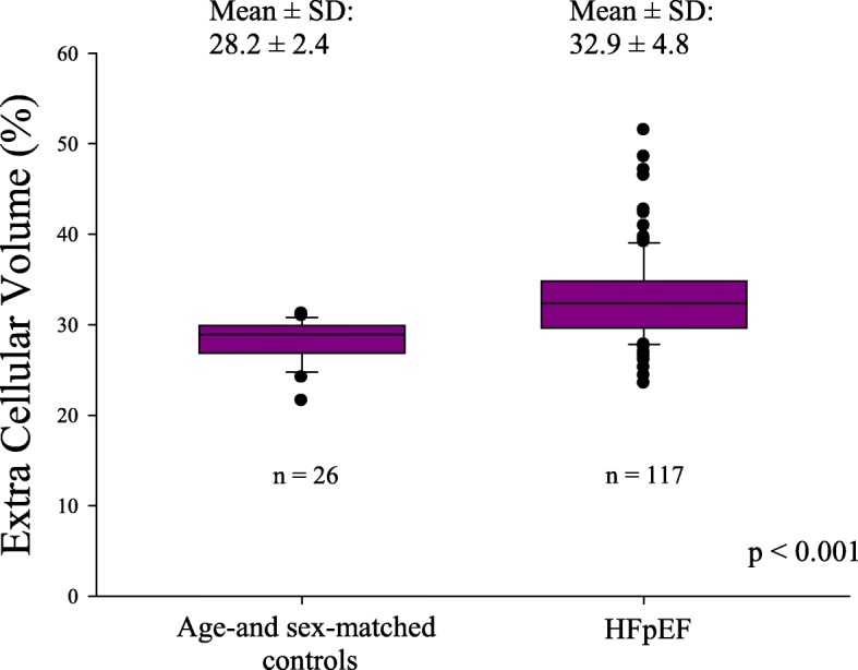Methods: We prospectively included 118 consecutive HFpEF patients. Diffuse myocardial fibrosis was estimated by extracellular volume (ECV) quantified by cardiovascular magnetic resonance with the modified Look-Locker inversion recovery sequence. We determined an ECV age- and sex-adjusted cutoff value (33%) in 26 controls.