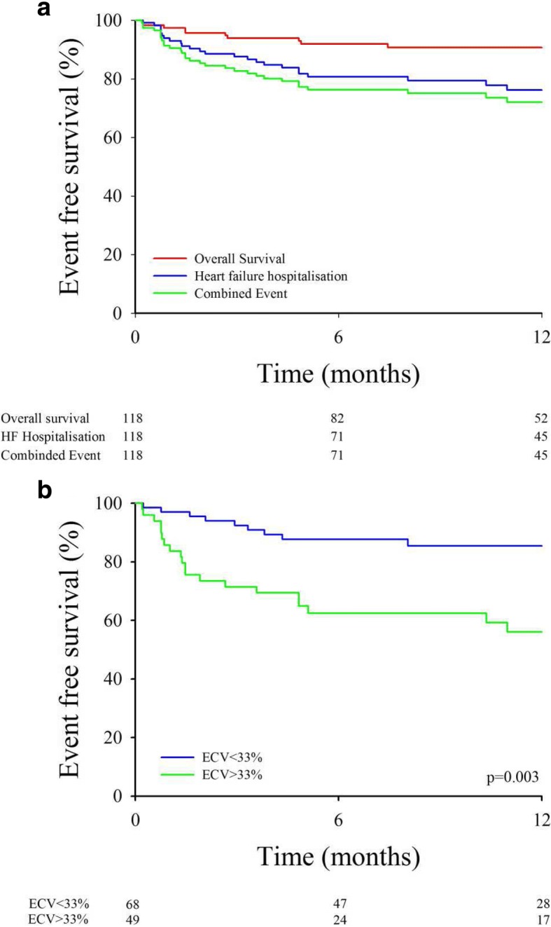 Results: Mean ECV was significantly higher in HFpEF patients versus healthy controls (32.9 ± 4.8% vs 28.2 ± 2.4%, P < 0.001). Multivariate logistic regression showed that body mass index (BMI) (odds ratio (OR) =0.92 [0.86-0.98], P = 0.011), diabetes (OR = 2.62 [1.11-6.18], P = 0.028), and transmitral peak E wave velocity (OR = 1.02 [1.00-1.03], P = 0.022) were significantly associated with abnormal ECV value. During a median follow-up of 11 ± 6 months, the primary outcome (all-cause mortality or first heart failure hospitalization) occurred in 38 patients. In multivariate Cox regression analysis, diabetes (hazard ratio (HR) =1.98 [1.04; 3.76], P = 0.038) and hemoglobin level (HR = 0.81 [0.67; 0.98], P = 0.028) were significant predictors of composite outcome. The ECV ability to improve this model added significant prognostic information. We then developed a risk score including diabetes, hemoglobin and ECV > 33% demonstrating significant prediction of risk and validated this score in a validation cohort of 53 patients. Kaplan-Meier curves showed a significant difference according to tertiles of the probability score (P < 0.001).