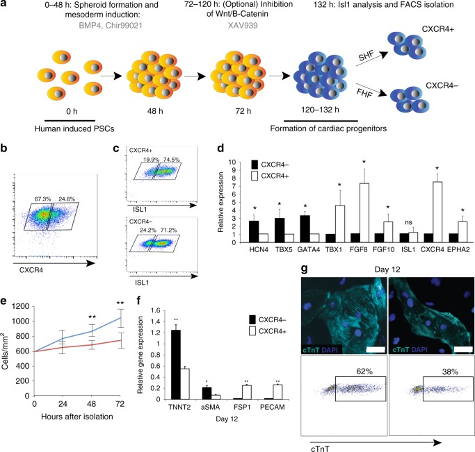 The discovery of the first heart field (FHF) and the second heart field (SHF) led us to understand how cardiac lineages and structures arise during development. However, it remains unknown how they are specified. Here, we generate precardiac spheroids with pluripotent stem cells (PSCs) harboring GFP/RFP reporters under the control of FHF/SHF markers, respectively. GFP+ cells and RFP+ cells appear from two distinct areas and develop in a complementary fashion. Transcriptome analysis shows a high degree of similarities with embryonic FHF/SHF cells. Bmp and Wnt are among the most differentially regulated pathways, and gain- and loss-of-function studies reveal that Bmp specifies GFP+ cells and RFP+ cells via the Bmp/Smad pathway and Wnt signaling, respectively. FHF/SHF cells can be isolated without reporters by the surface protein Cxcr4. This study provides novel insights into understanding the specification of two cardiac origins, which can be leveraged for PSC-based modeling of heart field/chamber-specific disease.