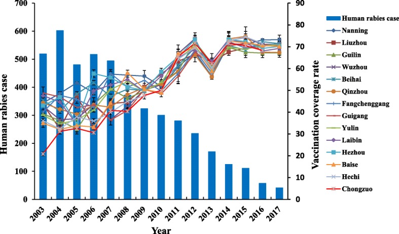 Results: The target effectiveness was achieved in the eradication, core, and peripheral areas in all three stages. The vaccination demonstration program successfully promoted RABV vaccination of domestic dogs throughout Guangxi Province by drawing upon the experience gained at key points. Compared with a vaccination coverage rate of 39.42-46.85% in Guangxi Province overall during 2003-2007, this rate gradually increased to 48.98-52.67% in 2008-2010, 60.24-69.67% in 2011-2013, and 70.09-71.53% in 2014-2016, thereby meeting World Health Organization requirements. The total cases of human rabies in the province decreased from 602 in 2004 to 41 cases in 2017.