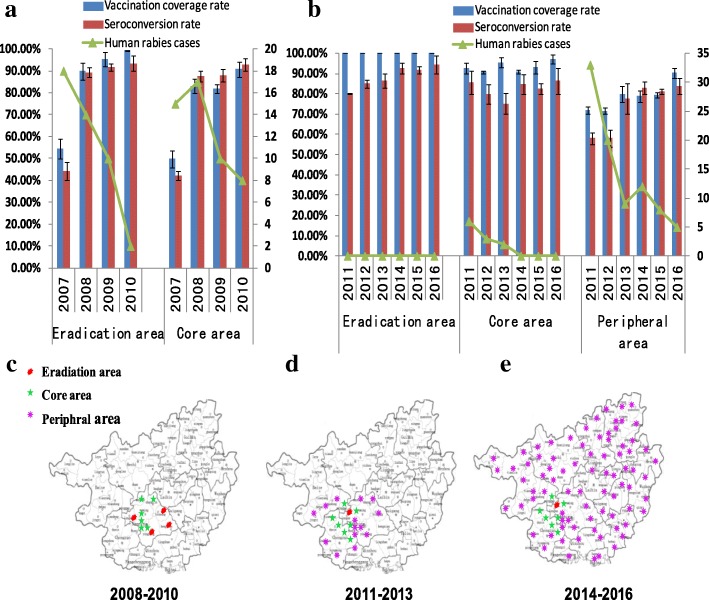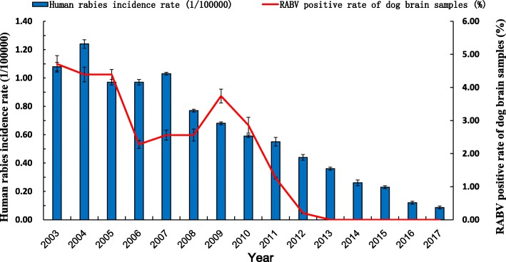 Methods: In this study, we established a rabies vaccination demonstration program that included eradication, core, and peripheral areas. This program was implemented for 9 years and comprised three stages: 12 counties in the first stage (2008-2010), 21 counties in the second stage (2011-2013), and then extending to all counties of Guangxi Province in the third stage (2014-2016). The program included a dog vaccination campaign, surveillance of clinically healthy dogs who may be potential RABV carriers, monitoring anti-RABV antibody titers in vaccinated dogs, and compiling and reporting statistics of human rabies cases.