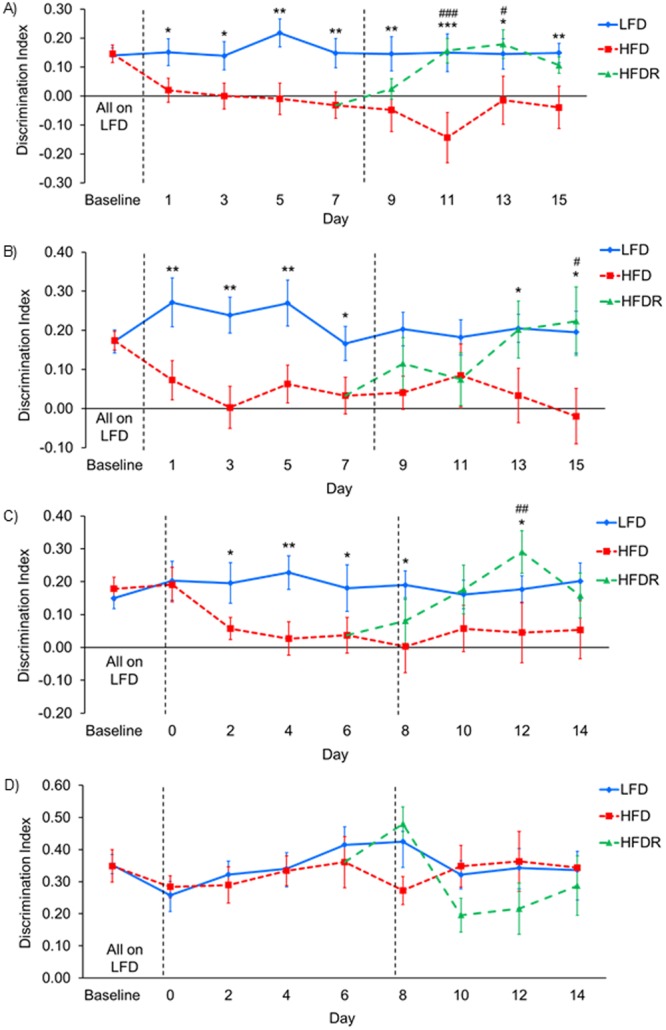 Alzheimer's disease is a leading cause of morbidity and mortality with no cure and only limited treatment available. Obesity and type 2 diabetes are positively associated with the development of premature cognitive decline and Alzheimer's disease, linking diet with these conditions. Here we demonstrate that in mice episodic memory, together with spatial and contextual associative memory, is compromised after only one day of high-fat diet. However, object memory remains intact. This shows not only a more rapid effect than previously reported but also that more complex memories are at higher risk of being compromised by a high-fat diet. In addition, we show that these memory deficits are rapidly reversed by switching mice from a high-fat diet back to a low-fat diet. These findings have important implications for the contribution of nutrition to the development of cognitive decline and Alzheimer's disease.