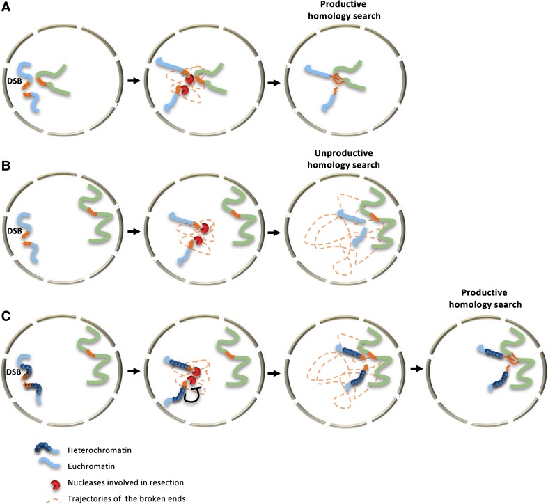 Keywords: DSB; Heterochromatin; Homologous recombination; Homology search; Nuclear organization; Resection.