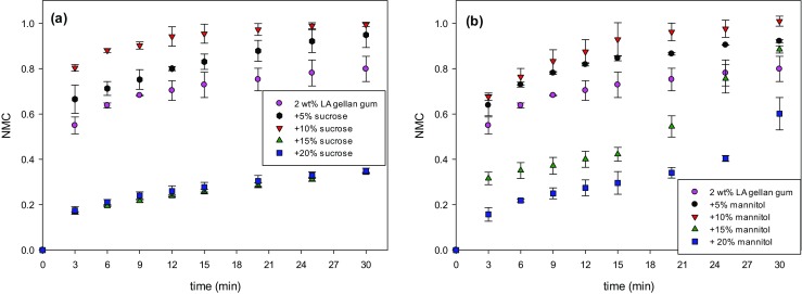 The effect of sucrose and mannitol addition to low-acyl (LA) gellan gum gels at both the molecular and macroscopic levels prior to, and after freeze-drying has been investigated. It has been shown that the gel network order as well as the mechanical properties are changed with the solute content, especially in the case of sucrose. The freeze-dried gel structure, containing either mannitol or sucrose, was studied, reporting for the first time the interaction of mannitol with the gellan gum gel. The generated freeze-dried gel network was evaluated in terms of porosity, pore size and wall thickness distributions. The solute physical state was correlated the water activity trend as a function of the solute content. Since mannitol is crystalline, the water activity decreases, in contrast with the amorphous sucrose. The rehydration mechanism was investigated and associated with the solute release from the structure. Specifically, the material properties (surface and bulk) as well as the role of the dissolution medium over time were assessed. It was found that the rehydration for both the gellan/sucrose and gellan/mannitol systems was highly influenced by the additive content, as an increase in water uptake was measured up to 10 wt%. A further increase in solute led to a considerable drop in the rehydration rate and extent due to the change in the freeze-dried structure, with smaller pores and with higher wall thickness values.