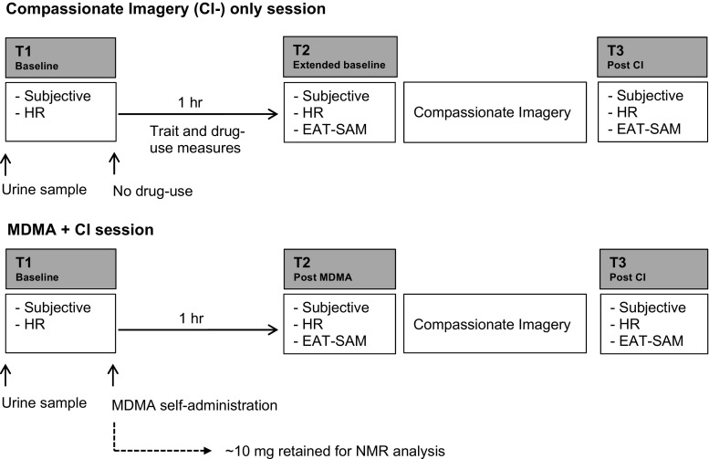 3,4-Methylenedioxymethylamphetamine (MDMA;'ecstasy') produces prosocial subjective effects that may extend to affiliative feelings towards the self. Behavioural techniques can produce similar self-directed affiliation. For example, compassionate imagery (CI) and ecstasy reduce self-criticism and increase self-compassion to a similar extent, with the effects of CI enhanced in the presence of ecstasy. Here, we examine self-compassion and self-criticism in recreational users who consumed chemically verified MDMA in a within-subjects crossover study. In a naturalistic setting, polydrug-using participants performed a self-focused CI exercise on two occasions separated by ≥6 days: once having consumed self-sourced MDMA and once not. Effects on state self-criticism, self-compassion and emotional empathy were assessed before and after MDMA use (or over an extended baseline period on the occasion that MDMA was not consumed) and reassessed after CI. In participants (n = 20; 8 women) whose ecstasy contained MDMA and no other drug, CI and MDMA appeared to separately increase emotional empathy (to critical facial expressions) and self-compassion. The effects of CI and MDMA on self-compassion also appeared to be additive. Establishing the observed effects in controlled studies will be critical for determining the combined utility of these approaches in fostering adaptive self-attitudes in a therapeutic context.