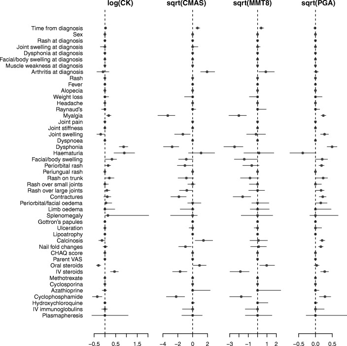 Results: Myalgia and dysphonia were associated with worse disease activity according to all outcome variables. Periorbital rash, rash on the trunk, rash over large joints, nail fold changes and facial swelling were associated with higher PGA. Notably, periorbital rash was also associated with higher CK and lower CMAS and nail fold changes with lower CMAS. Contractures were associated with lower CMAS and MMT8 and higher PGA. Patients with higher CMAS exhibited a higher MMT8 as well. PGA had the highest probability among the four outcome variables of being abnormal even if the other three outcome variables were normal.