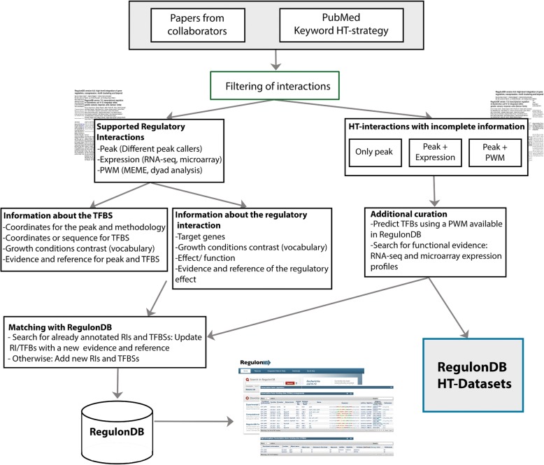 Results: In this paper, we describe an expansion of RegulonDB, the database containing the rich legacy of decades of classic molecular biology experiments supporting what we know about gene regulation and operon organization in E. coli K-12, to include the genome-wide dataset collections from 32 ChIP and 19 gSELEX publications, in addition to around 60 genome-wide expression profiles relevant to the functional significance of these datasets and used in their curation. Three essential features for the integration of this information coming from different methodological approaches are: first, a controlled vocabulary within an ontology for precisely defining growth conditions; second, the criteria to separate elements with enough evidence to consider them involved in gene regulation from isolated transcription factor binding sites without such support; and third, an expanded computational model supporting this knowledge. Altogether, this constitutes the basis for adequately gathering and enabling the comparisons and integration needed to manage and access such wealth of knowledge.