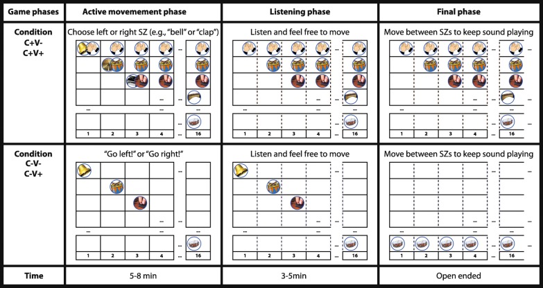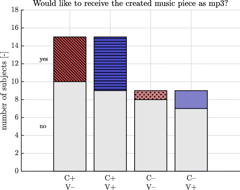 Methods: In a prospective randomized single-center study, healthy participants were randomly assigned to play two of the four training conditions, either with (V+) or without visual display (V-). In the third round, the participants played a repetition of the preferred condition of the two first rounds, this time with a new V condition (i.e., with or without visual display). For each of the three rounds, motivation was measured with the Intrinsic Motivation Inventory (IMI) in the subscales interest/enjoyment, perceived choice, value/usefulness, and man-machine-relation. We recorded the actual training time, the time of free movement, and the velocity profile and administered a questionnaire to measure perceived training time and perceived effort. All measures were analysed using linear mixed models. Furthermore, we asked if the participants would like to receive the created music piece.