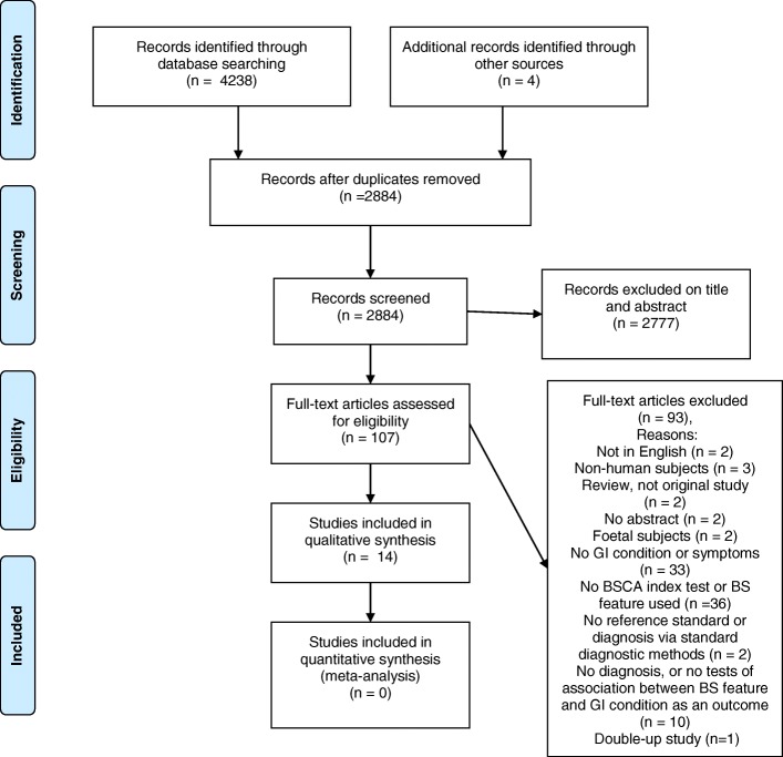 Results: Two thousand eight hundred eighty-four studies were retrieved; however, only 14 studies were included. Most of these simply assessed associations between a bowel sound feature and a condition. Four studies also included assessments of diagnostic accuracy. We found many significant associations between a bowel sound feature and a GI condition. Receiver operating characteristic curve analyses revealed high sensitivity and specificity for an irritable bowel syndrome test, and a high negative predictive value for a test for post-operative ileus. Assessment of methodological quality identified weaknesses in all studies. We particularly noted a high risk of bias in patient selection. Because of the limited number of trials included and the variety in conditions, technology, and statistics, we were unable to conduct pooled analyses.