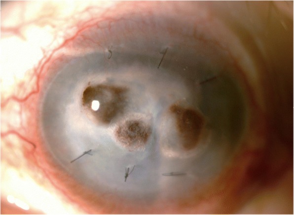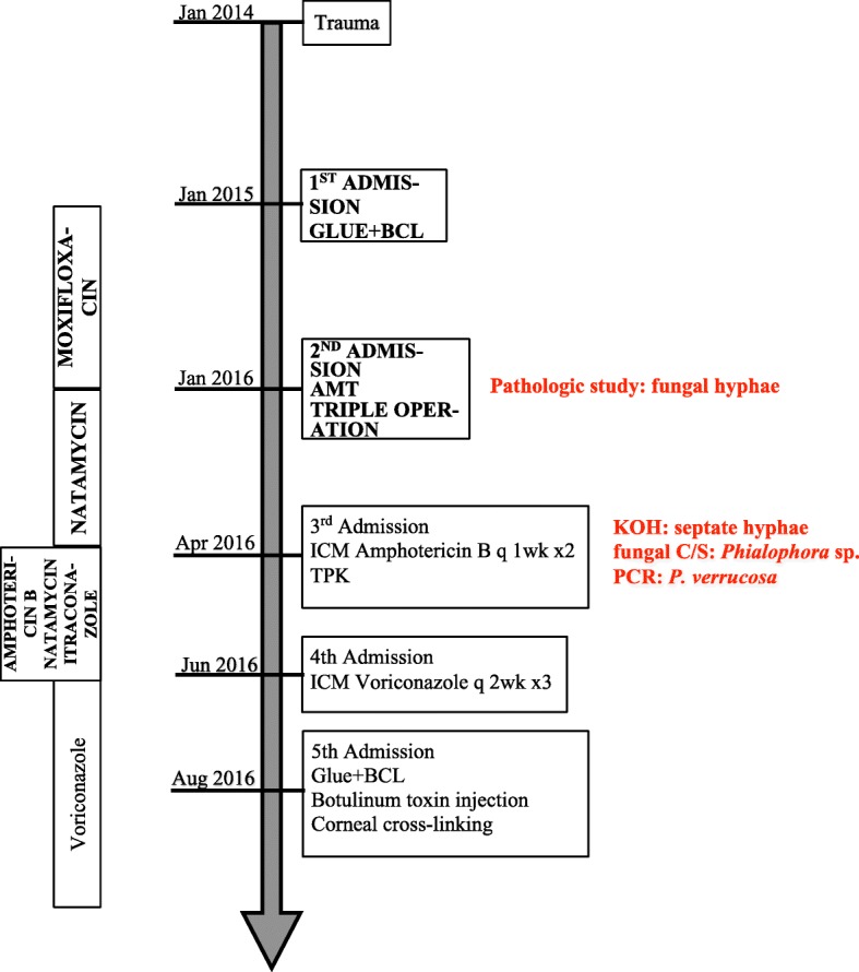 Conclusions: Because of the chronic nature of Phialophora verrucosa, a patient's first visit may occur many years after trauma, and sometimes clinical presentation might not appear to indicate fungal infection. Therefore, a high index of suspicion is needed in this situation. Voriconazole showed good results in our case. Instead of using a more invasive keratoplasty, we used corneal cross-linking to strengthen the corneal biomechanics. To the best of our knowledge, this is the first case showing the benefit of corneal cross-linking to improve corneal biomechanics in resolved Phialophora verrucosa keratitis.