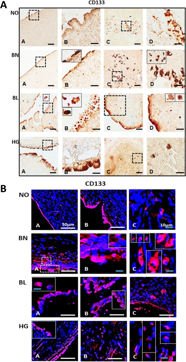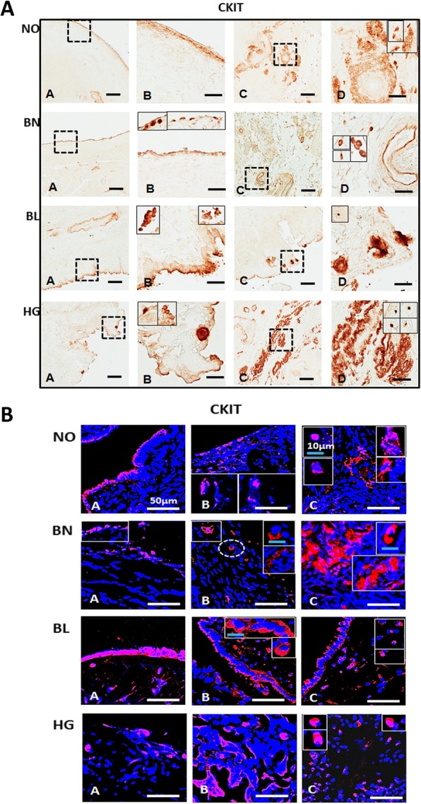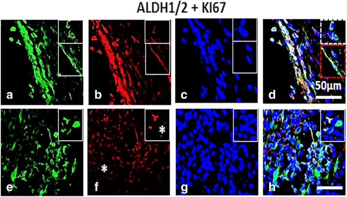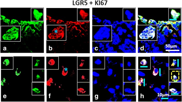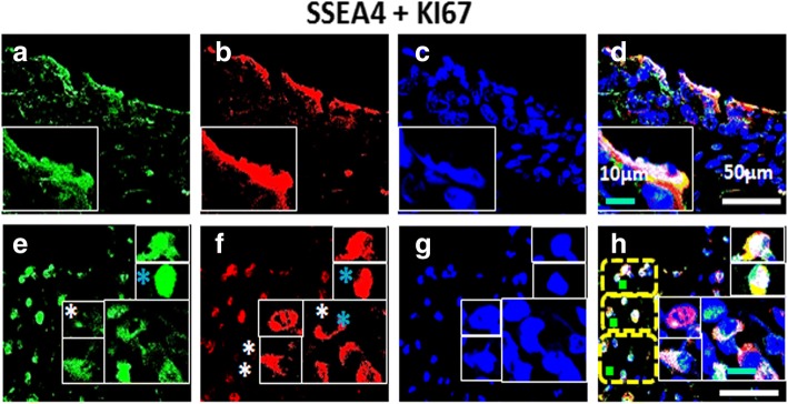 Results: In view of this, distribution of various CSC (ALDH1/2, C-KIT, CD133, CD24 and CD44) and cell proliferation (KI67) specific markers in the ovarian surface epithelium (OSE) and cortex regions in normal ovary, and benign, borderline and high grade metastatic ovarian tumors by immuno-histochemistry and confocal microscopy was studied. We further confirmed their expression by RT-PCR analysis. Co-expression analysis of stem cell (OCT4, SSEA4) and CSC (ALDH1/2, CD44 and LGR5) markers with proliferation marker (KI67) in HG tumors revealed dual positive proliferating stem and CSCs, few non-proliferating stem/CSC (SSEA4+/KI67- and ALDH1/2+/KI67-) and only KI67+ cells in cortex, signifying dynamic populations and interesting cellular hierarchy in cortex region. Smaller spherical (≤ 5 μm) and larger spindle/elliptical shaped (~ 10 μm) cell populations with high nucleo-cytoplasmic ratio were detected across all samples (including normal ovaries) but with variable distribution and characteristic stage-wise marker expression across different tumor stages.