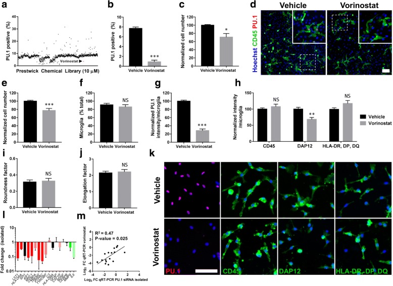Results: Bioinformatic analysis of gene expression upon PU.1 silencing in mixed glial cultures revealed a network of modified AD-associated microglial genes involved in the innate and adaptive immune systems, particularly those involved in antigen presentation and phagocytosis. These gene changes were confirmed using isolated microglial cultures. Utilising high throughput screening of FDA-approved compounds in mixed glial cultures we identified the histone deacetylase inhibitor vorinostat as an effective attenuator of PU.1 expression in human microglia. Further characterisation of vorinostat in isolated microglial cultures revealed gene and protein changes partially recapitulating those seen following siRNA-mediated PU.1 knockdown. Lastly, we demonstrate that several of these PU.1-regulated genes are expressed by microglia in the human AD brain in situ.