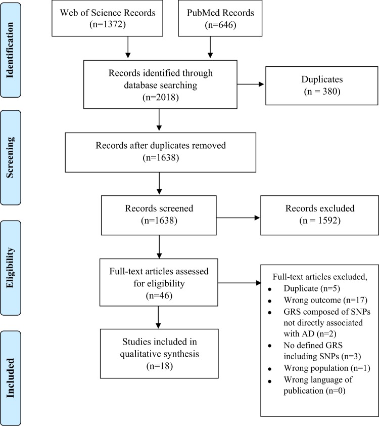 The ε4 allele of Apolipoprotein E (APOE) is the strongest known genetic risk factor of Alzheimer's disease (AD) but does not account for the entirety of genetic risk. Genetic risk scores (GRSs) incorporating additional genetic variants have been developed to determine the genetic risk for AD, yet there is no systematic review assessing the contribution of GRSs for AD beyond the effect of APOE ε4. The purpose of this systematic PRISMA (Preferred Reporting Items for Systematic Reviews and Meta-analyses)-based review was to summarize original research studies that have developed and validated a GRS for AD utilizing associated single nucleotide polymorphisms (SNPs). The PubMed and Web of Science databases were searched on April 6, 2018 and screening was completed on 2018 citations by two independent reviewers. Eighteen studies published between 2010 and 2018 were included in the review. All GRSs expressed significant associations or discrimination capability of AD when compared to clinically normal controls; however, GRS prediction of MCI to AD conversion was mixed. APOE ε4 status was more predictive of AD than the GRSs, although the GRSs did add to AD prediction accuracy beyond APOE ε4. GRSs might contribute to identifying genetic risk of AD beyond APOE. However, additional studies are warranted to assess the performance of GRSs in independent longitudinal cohorts.