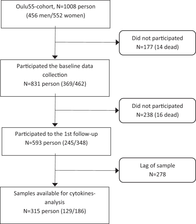 Inflammation plays a significant role in pathogenesis of diabetes and atherosclerosis. Increased adiposity with an upregulation of cytokines in prediabetes has been associated with vascular inflammation and considered a leading causal factor for type 2 diabetes (T2D). Information on adipokines and inflammatory markers in prediabetes, defined by hemoglobin A1C (HbA1c) 5.7-6.4% in addition to impaired fasting glucose (IFG) and impaired glucose tolerance (IGT), are sparse. We conducted a population-based cross-sectional study (part of a follow-up study) of inhabitants of Oulu, Finland, born in 1935. Inflammatory markers and traditional risk markers of 367 subjects were measured. The glucose status was determined by an oral glucose tolerance test (OGTT) and HbA1c. Inflammatory markers and glycemic levels were analysed using analysis of covariance (ANCOVA). Of the participants, 193 were normoglycemic, 82 had prediabetes and 40 T2D. Inflammatory cytokines were significantly higher in subjects with prediabetes as compared to normoglycemic subjects: IL-4 (14.9 vs 5.9 pg/ml, p = 0.041), IP-10 (251 vs 209 pg/ml, p = 0.05), TNF-α (10.4 vs 6.9 pg/ml, p = 0.027), RANTES (43.3 vs 33.1 pg/ml, p = 0.009), CD40L (3708 vs 1671 pg/ml, p = 0.010) and VEGF (269 vs 174 pg/ml, p = 0.013). These inflammatory cytokines remained significant even after adjustment for waist circumference. The differences in inflammatory markers in prediabetic and T2D subjects were not statistically significant. Prediabetes was associated with low-grade inflammation with increased inflammatory cytokine levels, while the levels in prediabetic subjects were comparable to those in T2D subjects. The associations were independent of visceral adiposity.