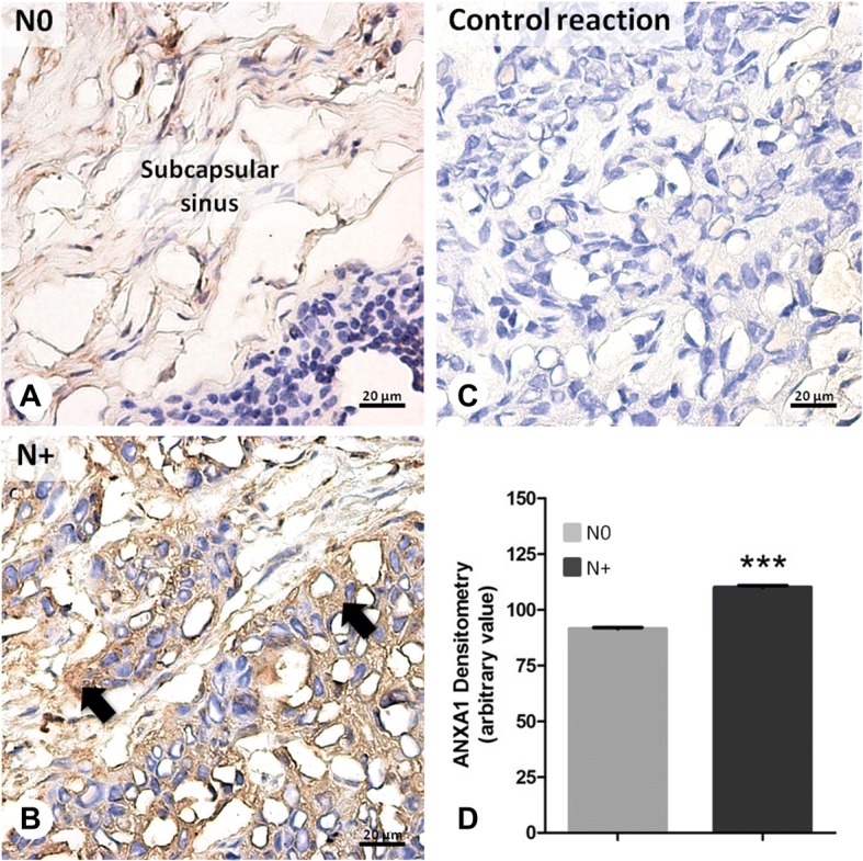 Results: Comparison of metastatic and non-metastatic lymph nodes showed 52 differentially expressed proteins associated with neoplastic development and progression. The results reinforced the idea that tumors from different anatomical subsites have dissimilar behaviors, which may be influenced by micro-environmental factor including the lymphatic network. The expression pattern of heat shock proteins and glycolytic enzymes also suggested an effect of the lymph node environment in controlling tumor growth or in metabolic reprogramming of the metastatic cell. Our study, for the first time, provided direct evidence of annexin A1 overexpression in lymph node metastasis of head and neck cancer, adding information that may be useful for diagnosing aggressive disease.