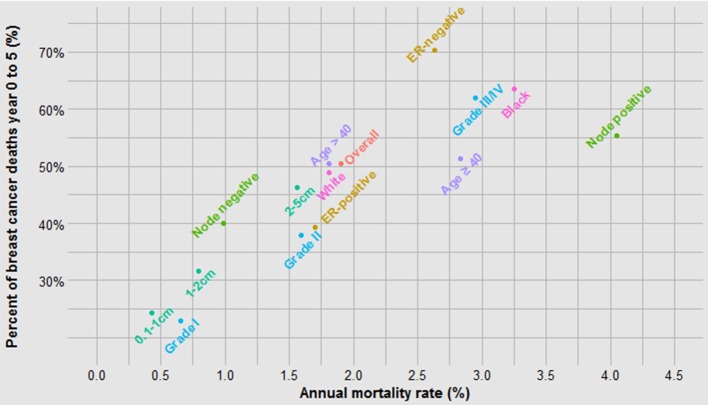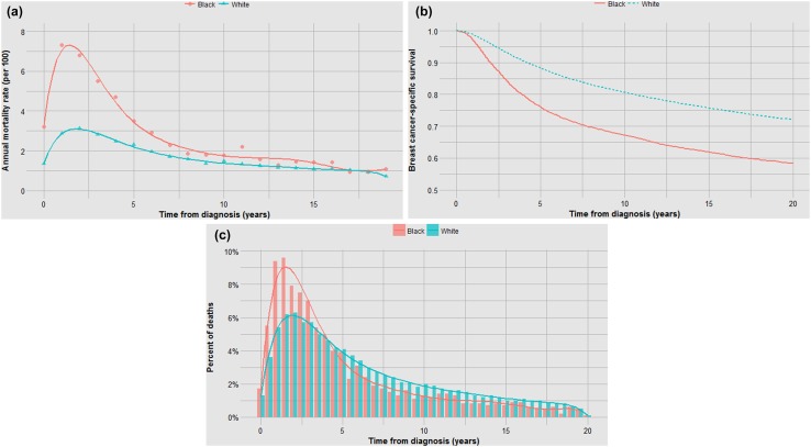 Purpose: To describe the mortality experience of women who die of breast cancer in the 20-year period post-diagnosis using various metrics, including annual mortality rates, Kaplan-Meier survival curves and time-to-death histograms.
