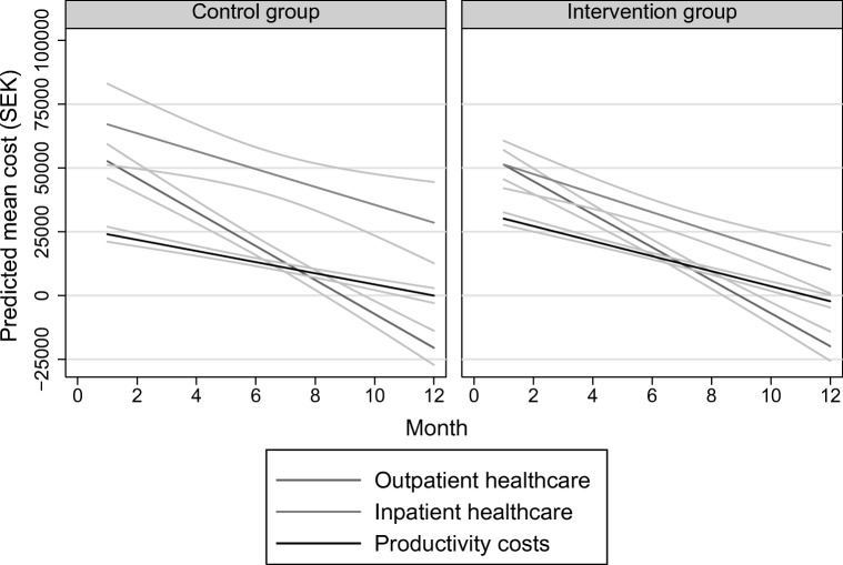 Methods: In this randomized clinical trial of a person-centred intervention, patients were planned for outpatient oncology treatment in a Swedish university hospital between 2012 and 2014 and were followed during 1 year. Annual healthcare costs were identified from medical records and administrative register data. Productivity costs were calculated from reported sick leave. Health-related quality of life was collected using the EuroQol Group's five-dimension health state questionnaire.