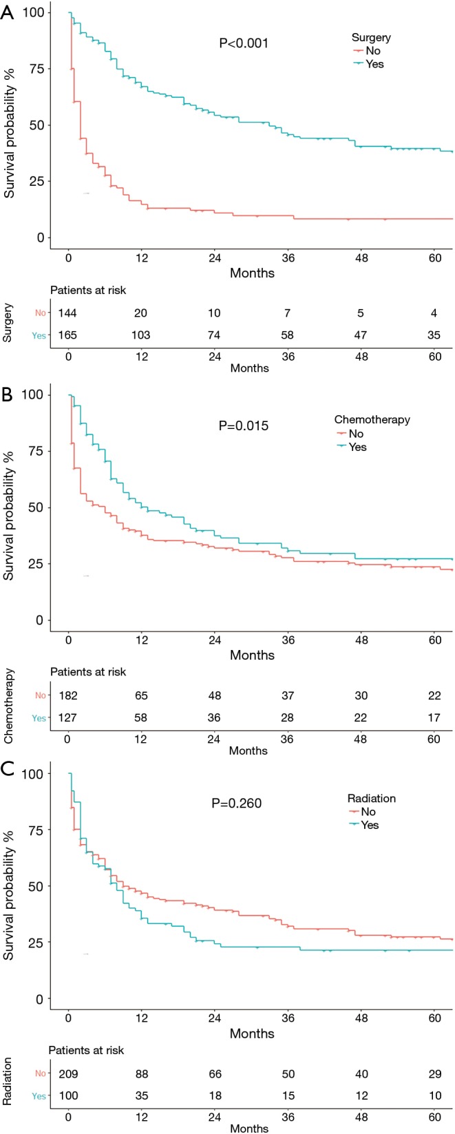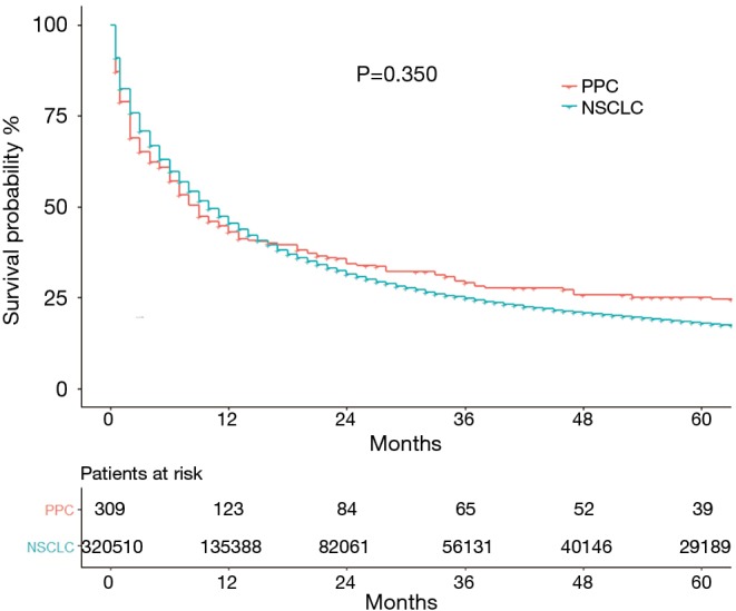 Methods: PPC patient information collected in the Surveillance, Epidemiology, and End Results (SEER) database between 2004 and 2014 were extracted, evaluated, and compared with NSCLC patient data. Overall survival (OS) was evaluated by the Kaplan-Meier method. Univariate analysis (UVA) and multivariate analysis (MVA) by the Cox proportional hazards regression identified risk factors that predicted OS and the results were used to construct a nomogram to predict 1-, 3-, and 5-year OS in PPC patients.