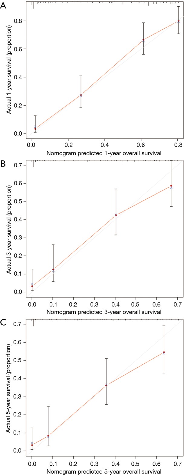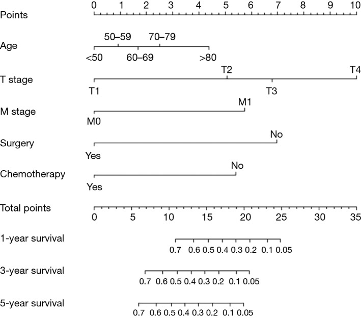 Conclusions: PPC had distinct clinicopathological characteristics. Age, T stage, M stage, surgery and chemotherapy were independently associated with OS. The nomogram accurately predicted 1-, 3- and 5-year OS.
