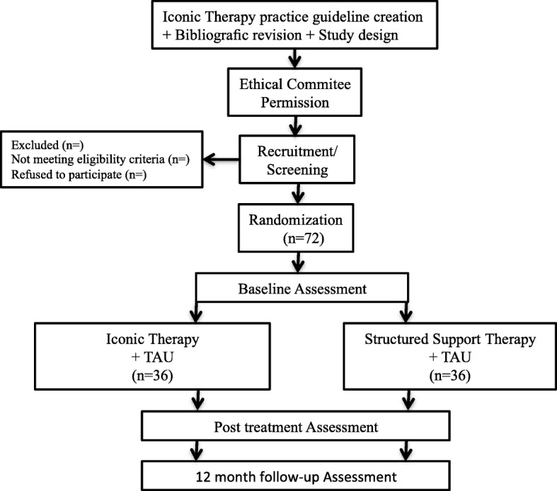 Methods/design: Our study will be a controlled 12-month pragmatic, two-armed RCT. A total of 72 young people (15 to 25 years old) with suicidal ideation/self-injuring behaviour and BPD traits and symptoms will participate in the study. The subjects will be randomised into two groups: Iconic Therapy or Structured Support Therapy. The participants will be assigned to either group on a 1:1 basis. Both the Iconic Therapy and the Structured Support Therapy programmes consist of 11 weekly sessions delivered by two trained psychologists in a group format of between 8 to 12 outpatients. The primary outcome will be measured by the change in symptom severity. Secondary outcomes include changes in suicidal ideation/ behaviour, non-suicidal self-injury, maladjustment to daily life and cost-effective analysis. The primary outcome will be a decrease in the severity of BPD symptoms as assessed by the Borderline Symptom List (BSL-23). For the clinical evaluation, three study assessments will take place: at baseline, after treatment and at 12-month follow-up. We hypothesise that patients attending the Iconic Therapy group will show a significantly higher reduction in symptoms than those in the Structured Support Therapy group. Data will be analysed using generalised estimating equation (GEE) models.