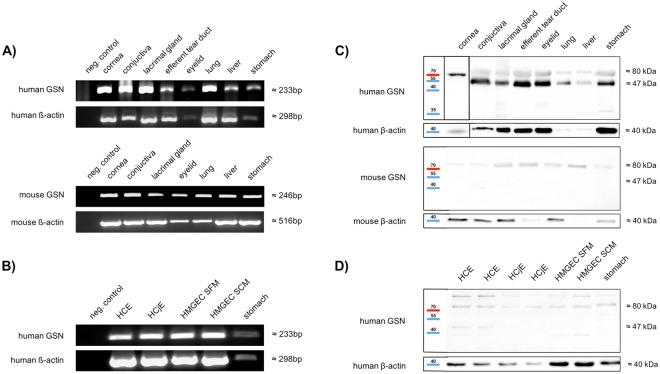Woundhealing disorders characterized by impaired or delayed re-epithelialization are a serious medical problem that is painful and difficult to treat. Gelsolin (GSN), a known actin modulator, supports epithelial cell regeneration and apoptosis. The aim of this study was to estimate the potential of recombinant gelsolin (rhu-pGSN) for ocular surface regeneration to establish a novel therapy for delayed or complicated wound healing. We analyzed the influence of gelsolin on cell proliferation and wound healing in vitro, in vivo/ex vivo and by gene knockdown. Gelsolin is expressed in all tested tissues of the ocular system as shown by molecular analysis. The concentration of GSN is significantly increased in tear fluid samples of patients with dry eye disease. rhu-pGSN induces cell proliferation and faster wound healing in vitro as well as in vivo/ex vivo. TGF-β dependent transcription of SMA is significantly decreased after GSN gene knockdown. Gelsolin is an inherent protein of the ocular system and is secreted into the tear fluid. Our results show a positive effect on corneal cell proliferation and wound healing. Furthermore, GSN regulates the synthesis of SMA in myofibroblasts, which establishes GSN as a key protein of TGF-β dependent cell differentiation.