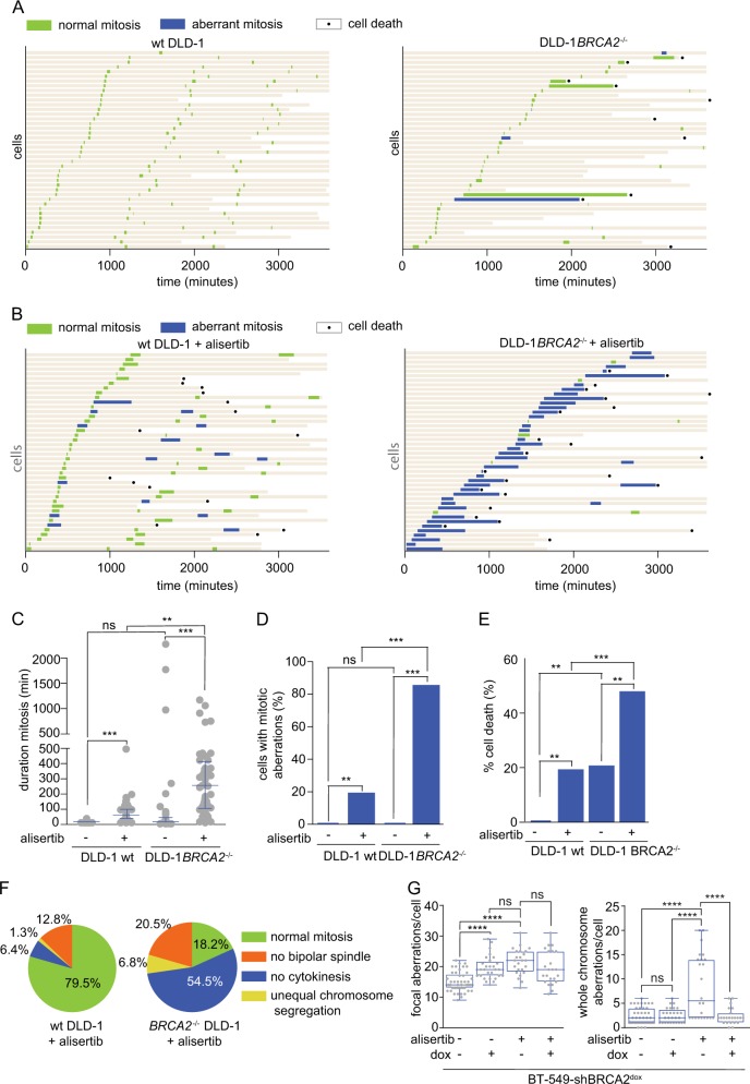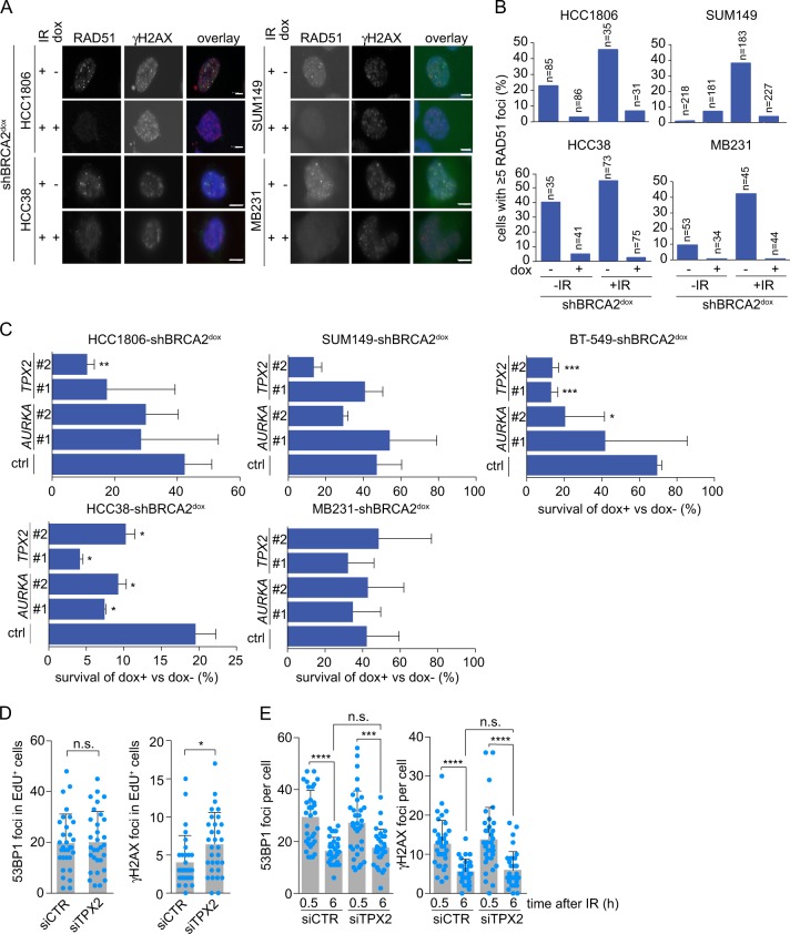 Genomic instability is a hallmark feature of cancer cells, and can be caused by defective DNA repair, for instance due to inactivation of BRCA2. Paradoxically, loss of Brca2 in mice results in embryonic lethality, whereas cancer cells can tolerate BRCA2 loss. This holds true for multiple DNA repair genes, and suggests that cancer cells are molecularly "rewired" to cope with defective DNA repair and the resulting high levels of genomic instability. In this study, we aim to identify genes that genomically unstable cancer cells rely on for their survival. Using functional genomic mRNA (FGmRNA) profiling, 16,172 cancer samples were previously ranked based on their degree of genomic instability. We analyzed the top 250 genes that showed a positive correlation between FGmRNA levels and the degree of genomic instability, in a co-functionality network. Within this co-functionality network, a strong cluster of 11 cell cycle-related genes was identified, including TPX2. We then assessed the dependency on these 11 genes in the context of survival of genomically unstable cancer cells, induced by BRCA2 inactivation. Depletion of TPX2 or its associated kinase Aurora-A preferentially reduced cell viability in a panel of BRCA2-deficient cancer cells. In line with these findings, BRCA2-depleted and BRCA2-mutant human cell lines, or tumor cell lines derived from Brca2-/-;p53-/- mice showed increased sensitivity to the Aurora-A kinase inhibitor alisertib, with delayed mitotic progression and frequent mitotic failure. Our findings reveal that BRCA2-deficient cancer cells show enhanced sensitivity to inactivation of TPX2 or its partner Aurora-A, which points at an actionable dependency of genomically unstable cancers.