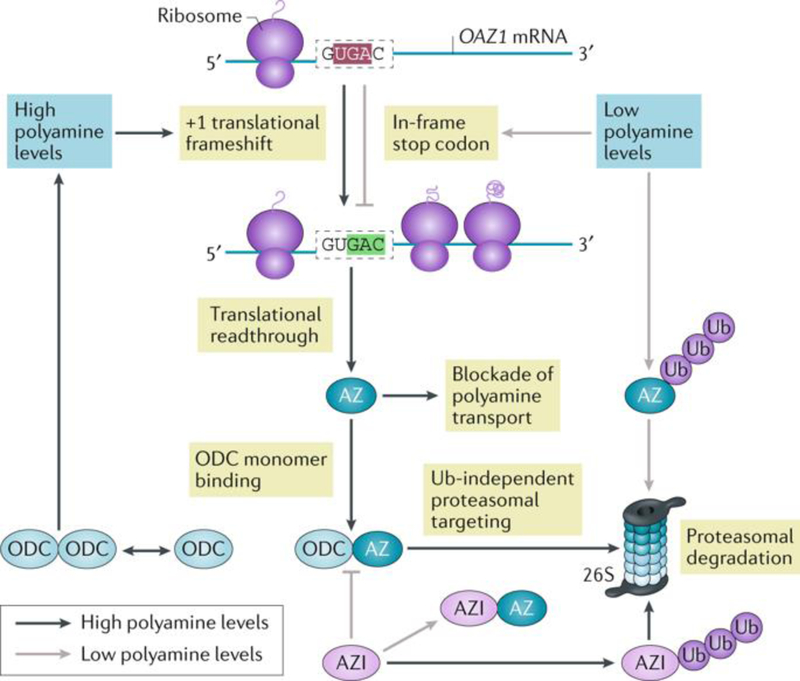 Advances in our understanding of the metabolism and molecular functions of polyamines and their alterations in cancer have led to resurgence in the interest of targeting polyamine metabolism as an anticancer strategy. Increasing knowledge of the interplay between polyamine metabolism and other cancer-driving pathways, including the PTEN-PI3K-mTOR complex 1 (mTORC1), WNT signalling and RAS pathways, suggests potential combination therapies that will have considerable clinical promise. Additionally, an expanding number of promising clinical trials with agents targeting polyamines for both therapy and prevention are ongoing. New insights into molecular mechanisms linking dysregulated polyamine catabolism and carcinogenesis suggest additional strategies that can be used for cancer prevention in at-risk individuals. In addition, polyamine blocking therapy, a strategy that combines the inhibition of polyamine biosynthesis with the simultaneous blockade of polyamine transport, can be more effective than therapies based on polyamine depletion alone and may involve an antitumour immune response. These findings open up new avenues of research into exploiting aberrant polyamine metabolism for anticancer therapy.