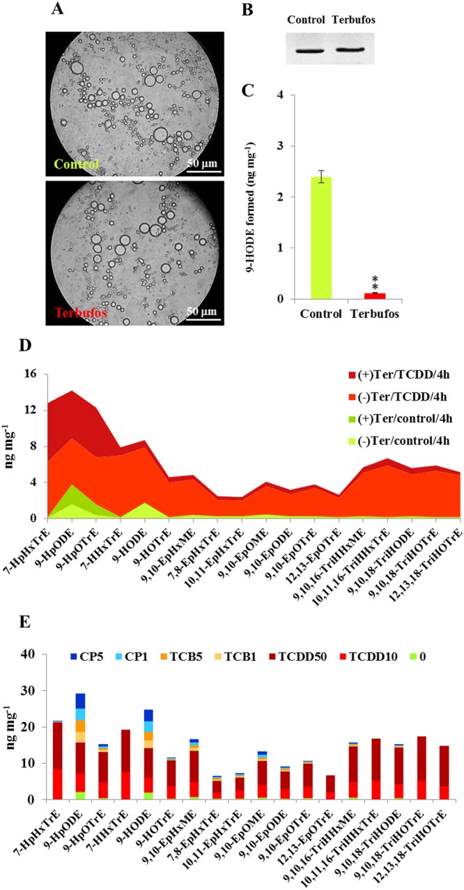 Dioxins are highly hazardous pollutants that have well characterized impacts on both animal and human health. However, the biological effects of dioxins on plants have yet to be described in detail. Here we describe a dioxin-inducible caleosin/peroxygenase isoform, PdPXG2, that is mainly expressed in the apical zone of date palm roots and specifically reduces 9-hydroperoxide fatty acids. A characteristic spectrum of 18 dioxin-responsive oxylipin (DROXYL) congeners was also detected in date palm roots after exposure to dioxin. Of particular interest, six oxylipins, mostly hydroxy fatty acids, were exclusively formed in response to TCDD. The DROXYL signature was evaluated in planta and validated in vitro using a specific inhibitor of PdPXG2 in a root-protoplast system. Comparative analysis of root suberin showed that levels of certain monomers, especially the mono-epoxides and tri-hydroxides of C16:3 and C18:3, were significantly increased after exposure to TCDD. Specific inhibition of PdPXG2 activity revealed a positive linear relationship between deposition of suberin in roots and their permeability to TCDD. The results highlight the involvement of this peroxygenase in the plant response to dioxin and suggest the use of dioxin-responsive oxylipin signatures as biomarkers for plant exposure to this important class of xenobiotic contaminants.