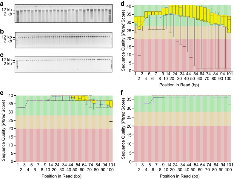 Results: We modified a non-organic solvent protocol to extract microgram quantities (1-13 μg) of sequencing-quality high molecular weight gDNA inexpensively in 96-well plates from either fresh, freeze-dried or silica gel-dried plant tissue. The protocol was effective for several easy and difficult-to-extract forage, crop, horticultural and common model species including Trifolium, Medicago, Lolium, Secale, Festuca, Malus, Oryza, and Arabidopsis. The extracted DNA was of high molecular weight and digested readily with restriction enzymes. Contrasting with other extraction protocols we assessed, Illumina-based sequencing of GBS libraries developed from this gDNA had very uniform high quality base-calls to the end of sequence reads. Furthermore, DNA extracted using this method has been sequenced successfully with the PacBio long-read platform. The protocol is scalable, readily automated without requirement for fume hoods, requires approximately three hours to process 192 samples (384-576 samples/day), and is inexpensive at US$0.62/sample for consumables.