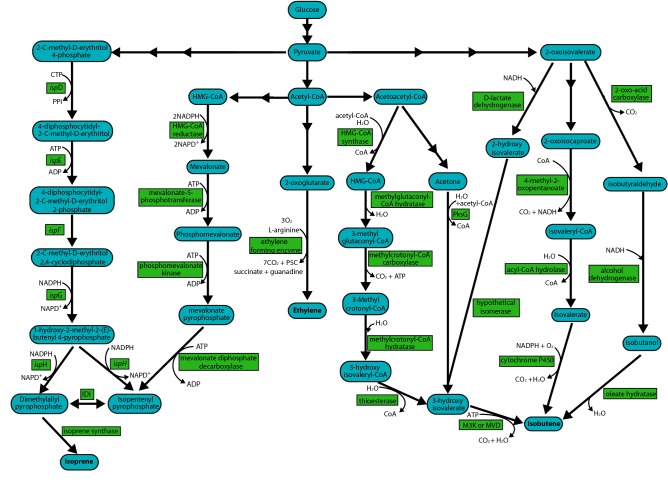 To reduce emissions from petrochemical refinement, bio-production has been heralded as a way to create economically valuable compounds with fewer harmful effects. For example, gaseous alkenes are precursor molecules that can be polymerized into a variety of industrially significant compounds and have biological production pathways. Production levels, however, remain low, thus enhancing bio-production of gaseous petrochemicals for chemical precursors is critical. This review covers the metabolic pathways and production levels of the gaseous alkenes ethylene, isoprene, and isobutene. Techniques needed to drive production to higher levels are also discussed.
