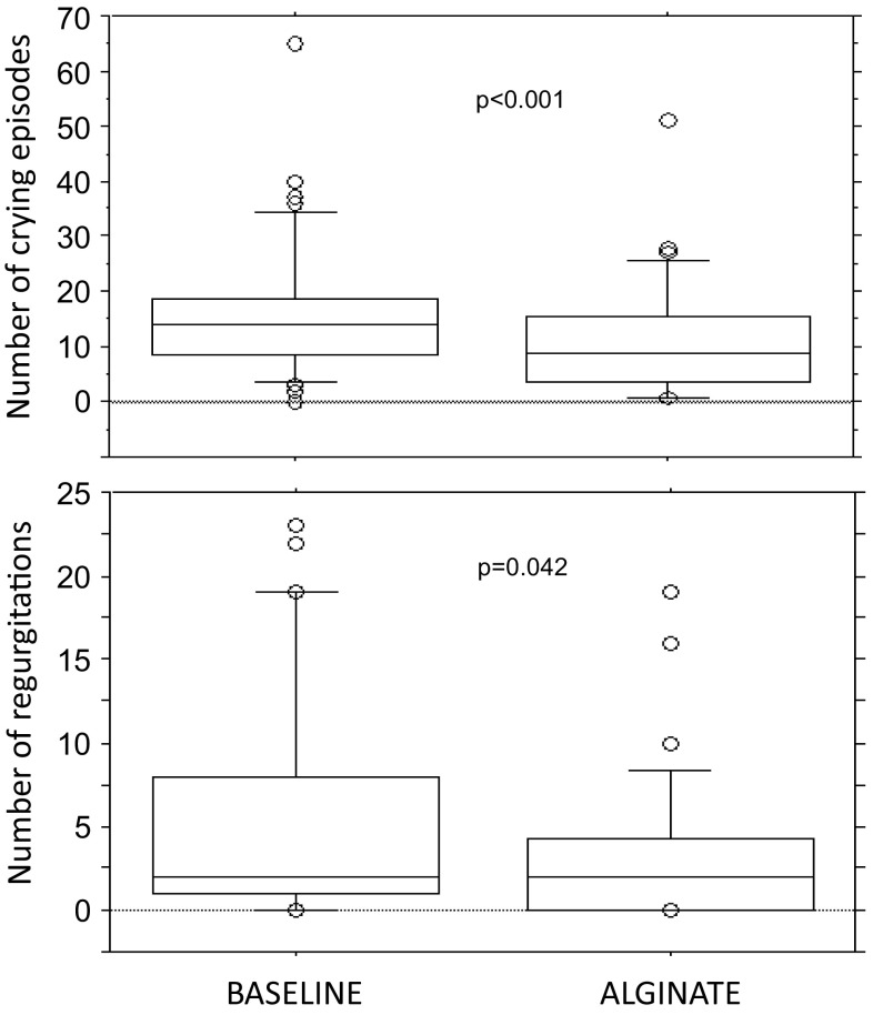 Results: We recruited 43 infants (median age 68 days, range 25-306); three pH-MII tracings were excluded because of artifacts. The median number of all MII reflux episodes was significantly reduced during alginate administration (76.0 vs 69.5; p < 0.001). Crying-fussiness, cough and regurgitation episodes all significantly improved during alginate administration (p = 0.00012; p = 0.005 and p = 0.04, respectively). The following MII parameters also decreased during the alginate administration: acid (19.0 vs 14.5; p < 0.04), non-acid (52.0 vs 49.5; p < 0.004), proximal GER episodes (46.0 vs 41.4; p < 0.007), and bolus exposure index (1.9 vs 1.6; p = 0.002). At least three out of seven pH-MII parameters decreased by > 10% during the alginate period in 31/40 infants (77.5%), without a significant difference between magnesium and sodium alginate.