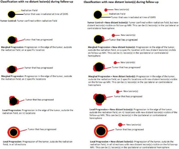 Results: TC was 37% for all tumors (TC was 50% in LGGs and 27% in HGGs). Local progression (LP) was 46% for all tumors (LP was 31% in LGGs and 58% in HGGs). New distant lesions were seen in 18% of all patients (in 5% of LGG patients and 31% of HGG patients). Median progression-free and overall survival (PFS and OS) for all patients were 10.5 and 34.4 months, respectively. Median PFS was 50.1 and 5.7 months for low and high grade tumors, respectively. Median OS was 86.6 and 12.8 months for low and high grade tumors, respectively. No serious adverse events were noted post-GKRS.