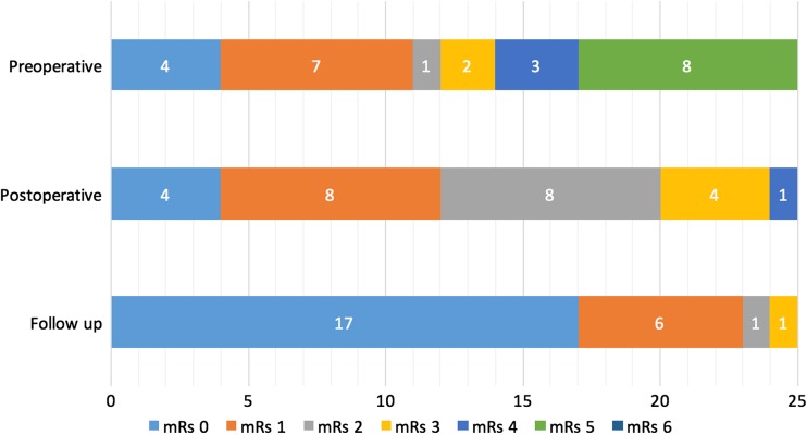 Results: In total, 25 children were included at mean age of 10 years (range 2-16 years). Nineteen patients (76%) presented with intracranial bleeding. Mean follow-up was 11.5 ± 5.3 years (range 4.1-24.4). Four (16%) of patients were treated with embolization, three (12%) with microsurgery, and 18 patients (72%) received a combination of different treatment modalities. Altogether, 21 (84%) were embolized, 14 (56%) were treated with microsurgery, and eight (32%) received stereotactic radiosurgery. One child had a worse mRs at discharge compared to admission; all others improved (n = 11) or were stable (n = 13). At follow-up, all patients scored a stable or improved mRs compared to discharge, with 23 children (92%) scoring mRs 0 or 1. These 23 children followed regular education during follow-up without specialized or adapted schooling. No significant differences in educational level with the age-matched general population were found.
