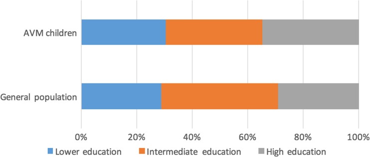 Methods: All children treated in our center between 1998 and 2016 for intracranial AVMs were reviewed. Patient characteristics, as well as AVM specifics, were collected. Functional outcomes were compared using the modified Rankin scale (mRs). Educational levels, using the International Standard Classification of Education (ISCED), were compared to the age-matched general population of the Netherlands.