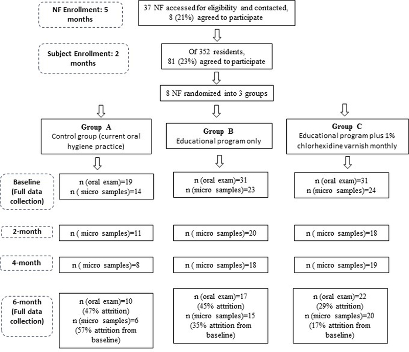 Results: Recruitment response rates were 21% for NFs and 23% for residents. A total of 81 residents were examined at baseline and of those, 49 were examined at 6 months (39.5% attrition). There were no statistically or clinically significant differences among the intervention groups at 6 months for any of the recorded clinical or microbiological outcomes.