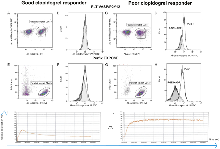 A recently released kit (PerFix EXPOSE) was reported to improve the measurement of the degree of phosphorylation of proteins in leukocytes by flow cytometry. We tested its adaptation for platelets to monitor vasodilator-stimulated phosphoprotein (VASP) phosphorylation, which is the basis of a currently used test for the assessment of the pharmacological response to P2Y12 antagonists (PLT VASP/P2Y12). The PerFix EXPOSE kit was compared to the PLT VASP/P2Y12 kit by using blood samples drawn at 24 h post clopidogrel dose from 19 patients hospitalized for a non-cardio-embolic ischemic stroke and treated with clopidogrel monotherapy for at least five days in an observational study. The platelet PerFix method was based on adaptation of the volume of the sample, the centrifugation speed and the incubation temperature. Poor agreement between prevention by adenosine diphosphate (ADP) of PGE1-induced cAMP-mediated VASP phosphorylation and ADP induced aggregation assessed by Light Transmittance Aggregometry was found. We found a significant correlation between the PLT VASP/P2Y12 kit and the PerFix EXPOSE kit. The PerFix EXPOSE kit may also be helpful to monitor adverse effects of second-generation tyrosine kinase inhibitors on platelets.