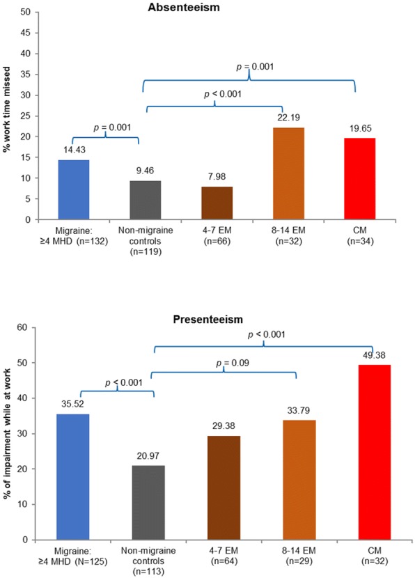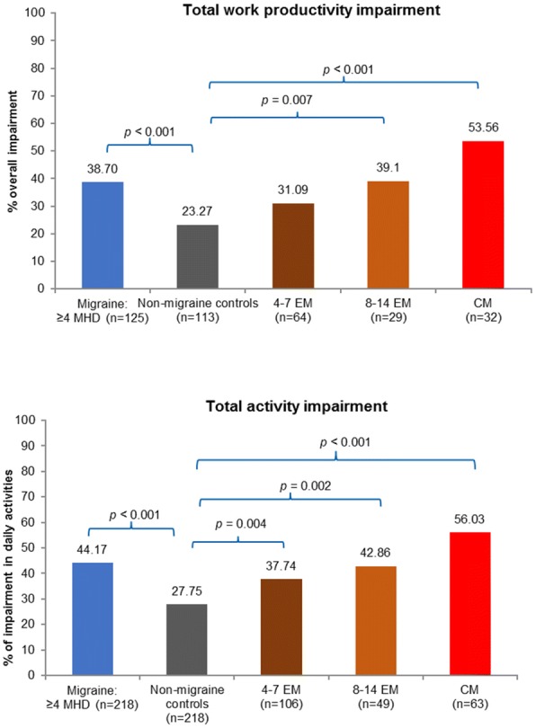 Results: HRQoL was lower in migraine individuals suffering from ≥4 MHDs compared with non-migraine controls, with reduced SF-36v2 PCS (46.00 vs 50.51) and MCS (37.69 vs 44.82), SF-6D health state utility score (0.62 vs 0.71), and EQ-5D score (0.68 vs 0.81) (for all, p < 0.001). Respondents with migraine suffering from ≥4 MHDs also reported higher levels of absenteeism from work (14.43% vs 9.46%; p = 0.001), presenteeism (35.52% vs 20.97%), overall work impairment (38.70% vs 23.27%), and activity impairment (44.17% vs 27.75%) than non-migraine controls (for all, p < 0.001). Additionally, HRU was significantly higher for individuals with ≥4 MHDs compared to their matched controls. Consistently, migraine subgroups (4-7 MHDs, 8-14 MHDs and CM) had lower HRQoL, greater overall work and activity impairment, and higher HRU compared to non-migraine controls.