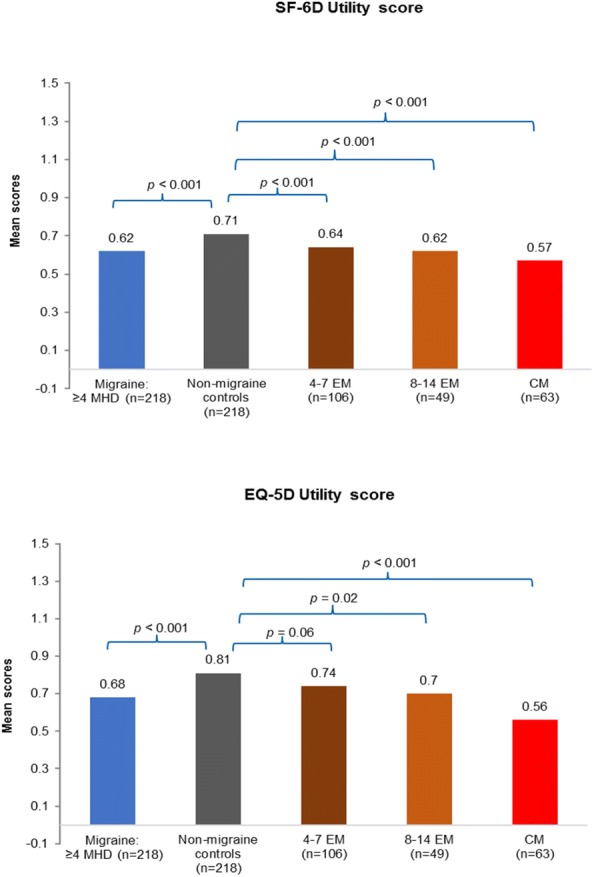 Methods: This retrospective cross-sectional study used data from the 2016 National Health and Wellness Survey (NHWS; N = 80,600). Short-Form 36-Item Health Survey, version 2 (SF-36v2) physical and mental component summary scores (PCS and MCS), Short-form-6D (SF-6D), and EuroQoL (EQ-5D), impairments to work productivity and daily activities (Work Productivity and Activity Impairment Questionnaire (WPAI), and HRU were compared between migraine respondents suffering from ≥4 MHDs (n = 218) and non-migraine controls (n = 218) by propensity score matching using sociodemographic characteristics. Chi-square, T-tests, and Mann-Whitney tests were performed to determine significant differences between the groups after propensity score matching.