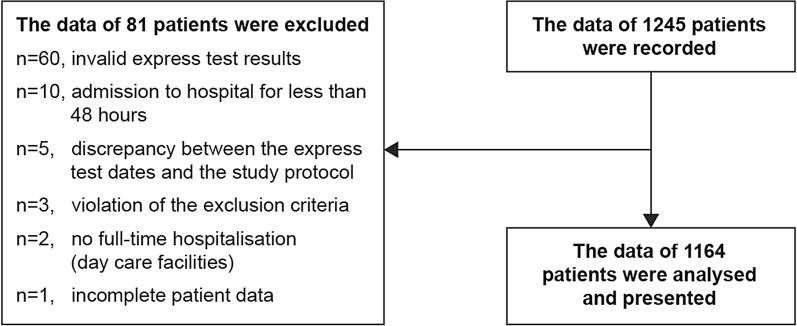 Results: From April 2016 to April 2017, a total of 1245 patients from 12 large hospitals were enrolled in the study. Data on 81 patients were excluded from the analysis for different reasons. Data on 1164 patients (45.2% males and 54.8% females) with a mean age of 54.9 years (range 18-95 years) were analysed. Length of hospitalisation was 2-188 days (median, 8 days). The EIA stool test showed CDAD-positive results in 21.7% (253/1164) patients. The patients were from surgery units (546/1164), internal medicine units (510/1164) and intensive care units (108/1164). The prevalence of CDAD among patients from surgery, internal medicine and intensive care units was 26.2, 17.8 and 17.6%, respectively. Oncology, gastroenterology, septic surgery, oncohaematology and general medical hospital units accounted for more than 75% of all patients included; the prevalence of CDAD by those hospital units was 11.3, 15.0, 39.2, 17.6, and 27.2%, respectively. The proportion of GDH-positive and toxin A/B-negative patients by the rapid stool test result was 16.8% (196/1164). The prevalence of CDAD varied widely between the hospitals (from 0 to 44.3%).
