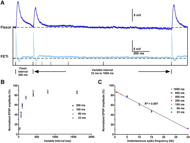 Reversible decreases in synaptic strength, known as short-term depression (STD), are widespread in neural circuits. Various computational roles have been attributed to STD but these tend to focus upon the initial depression rather than the subsequent recovery. We studied the role of STD and recovery at an excitatory synapse between the fast extensor tibiae (FETi) and flexor tibiae (flexor) motor neurons in the desert locust (Schistocerca gregaria) by making paired intracellular recordings in vivo. Over behaviorally relevant pre-synaptic spike frequencies, we found that this synapse undergoes matched frequency-dependent STD and recovery; higher frequency spikes that evoke stronger, faster STD also produce stronger, faster recovery. The precise matching of depression and recovery time constants at this synapse ensures that flexor excitatory post-synaptic potential (EPSP) amplitude encodes the presynaptic FETi interspike interval (ISI). Computational modelling shows that this precise matching enables the FETi-flexor synapse to linearly encode the ISI in the EPSP amplitude, a coding strategy that may be widespread in neural circuits.